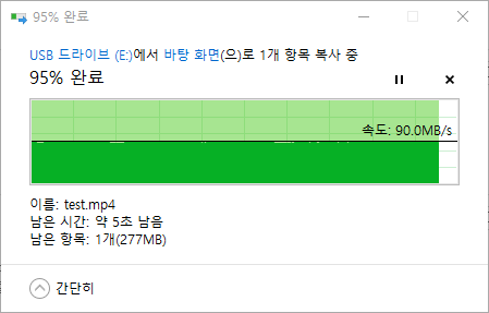 실제 파일을 복사하면서 읽기/쓰기 속도를 측정했습니다. 읽는 90MB/s, 쓰기는 26.3MB/s로 나오고 있습니다. UHS-1을 지원하는 SD 카드들은 대부분 이정도 속도가 나옵니다.